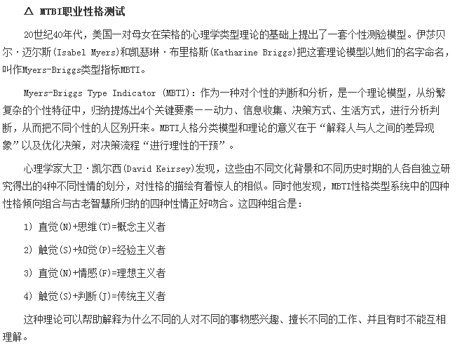 每個(gè)人從小到大都會(huì )積累這些自我認識,別人的一句話(huà)評論,老師對你作文的評語(yǔ)都是你認識自己的途徑。專(zhuān)業(yè)認識自我的方法有很多,世界上幫助人們對自己進(jìn)行客觀(guān)的自我評估的方法有很多,如心理測試,應用韋氏量表、瑞文智力測驗智商,卡特爾的16PF的人格測試都是具體應用。其中國際上最為流行的職業(yè)人格評估工具莫過(guò)于MTBI職業(yè)性格測試了。
