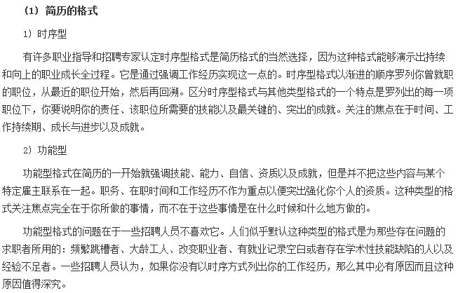 這種綜合型格式很受招聘機構的歡迎。事實(shí)上,它既強化了時(shí)序型格式的功能同時(shí)又避免了使用功能型格式而招致的懷疑。當功能部分信息充實(shí),有閱讀者感興趣的材料而且工作經(jīng)歷部分的內容又能夠強有力地作為佐證加以支持時(shí),尤為如此。