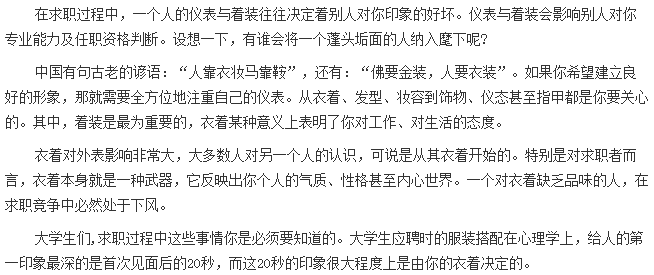 職業(yè)套裝是比較簡(jiǎn)單而且安全的選擇。在套裝的選擇上,需要注意兩點(diǎn)。首先,套裝的質(zhì)量不能很差。如果穿一件線(xiàn)頭和褶皺很多的套裝去面試,會(huì )給人吊兒郎當的感覺(jué),也會(huì )讓整個(gè)人的精神狀態(tài)大打折扣。因此,只要條件允許,盡量選擇做工精細、質(zhì)地考究的職業(yè)套裝。套裝的剪裁要貼合身體比例,同學(xué)們可以選擇正規專(zhuān)業(yè)的公司度身訂制一兩套,其實(shí)挺多職內人士都穿著(zhù)訂制的套裝,只要剪裁得體,價(jià)格合理,又何樂(lè )而不為呢?