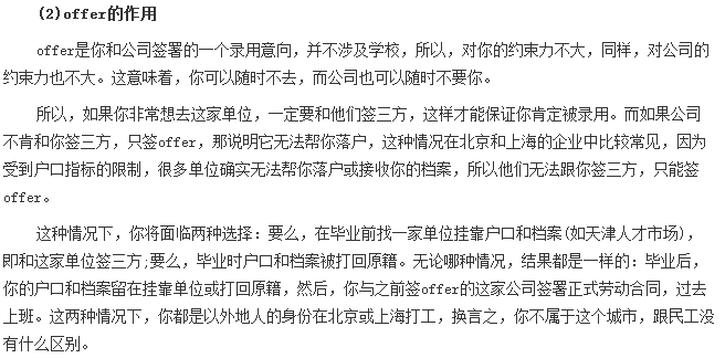 offer,全稱(chēng)是offer letter,漢語(yǔ)解釋為錄用信、錄取通知。所謂offer letter,還沒(méi)一個(gè)統一的名字,有人稱(chēng)之為“錄取通知”,有人謂之“錄用信”,也有人稱(chēng)為“要約函”。以一般是說(shuō)外企或國外學(xué)校發(fā)的表達自己愿意錄用的一封格式類(lèi)似的信件,后來(lái)很多人都把自己接到公司的“offer letter”,電話(huà)通知等一類(lèi)的叫offer,被公司通知面試合格能夠錄用就說(shuō)收到了offer,而真正發(fā)offer letter的也只是很正規的大企業(yè)。此外,也有人說(shuō)offer是“錄取通知書(shū)加全額獎學(xué)金”。