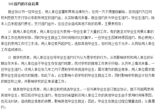 辦理違約要經(jīng)過(guò)這樣嚴格的手續和程序,體現了就業(yè)協(xié)議的嚴肅性和國家就業(yè)計劃的嚴肅性。因此,我們不得不十分慎重。同時(shí),特別提醒畢業(yè)生同學(xué):請慎重選擇就業(yè)單位、慎重簽訂就業(yè)協(xié)議、慎重考慮違約事宜。雖然違約是我們的權利,但是它畢竟帶給各方不少的麻煩,承擔違約責任時(shí)還帶給父母一定的經(jīng)濟負擔,自己也要承受巨大的心理壓力。