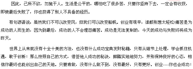 創(chuàng )業(yè):一個(gè)引人誘惑的詞,使每個(gè)應屆畢業(yè)生產(chǎn)生幻想?偠灾,羅馬非一日之功而建,創(chuàng )業(yè)也不是一蹴而就的“小兒科”,在創(chuàng )業(yè)的道路上,自主創(chuàng )業(yè)也是另一種可行的選擇,成功者有之,失敗的教訓恐怕更多。創(chuàng )業(yè)也一樣需要規劃,你的性格是否適合創(chuàng )業(yè)?如何選擇行業(yè)?啟動(dòng)資金來(lái)源在哪兒?風(fēng)險評估和管理如何進(jìn)行?創(chuàng )業(yè)同樣是一條漫長(cháng)的路,是一條非常艱辛的路。充滿(mǎn)了坎坷,充滿(mǎn)了辛酸。在創(chuàng )業(yè)的路程中,你享受的成功的喜悅是很少的5%,而95%以上是你要飽嘗了辛酸,所以,你要去堅持,你要有信念,要相信自己,別放棄信念,奇跡每天都在上演。