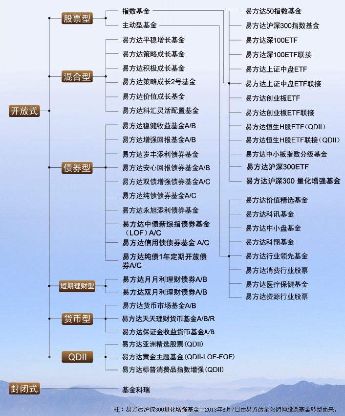 截至2012年9月30日,易方達旗下共管理37只開(kāi)放式基金、1只封閉式基金,涵蓋主動(dòng)型股票基金、完全復制型指數基金、增強型指數基金、混合型基金、債券型基金、貨幣市場(chǎng)基金等多種類(lèi)型。