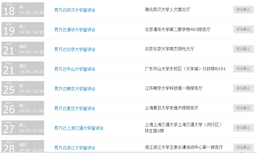 注意:2014年校園宣講會(huì )未必如此,因此請經(jīng)常關(guān)注應屆畢業(yè)生網(wǎng)宣講會(huì )查詢(xún)系統,以便得到最新最準確的易方達基金校園宣講會(huì )信息。