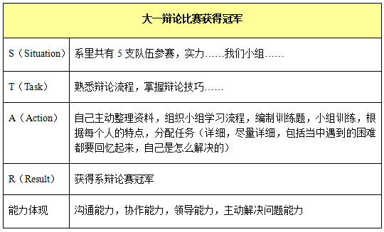 開(kāi)放性問(wèn)題大家都要回答吧?大家也都知道,其實(shí)每一個(gè)開(kāi)放性問(wèn)題都在考查自己的每一項能力,如領(lǐng)導能力,溝通能力,適應能力等等。而挖掘閃光點(diǎn)就是在這些事件模塊中找出你所能體現的這些能力,如上例辯論賽中所體現的領(lǐng)導能力,溝通能力,主動(dòng)解決問(wèn)題。這時(shí)候,就可以在下面加多一行,能力體現。