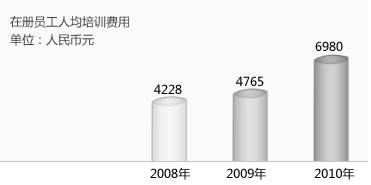 我們投入的培訓費逐年遞增,以為員工提供更多更好的培訓內容和機會(huì )。2010年的培訓費用達到1639萬(wàn)元,人均培訓費為6812元。